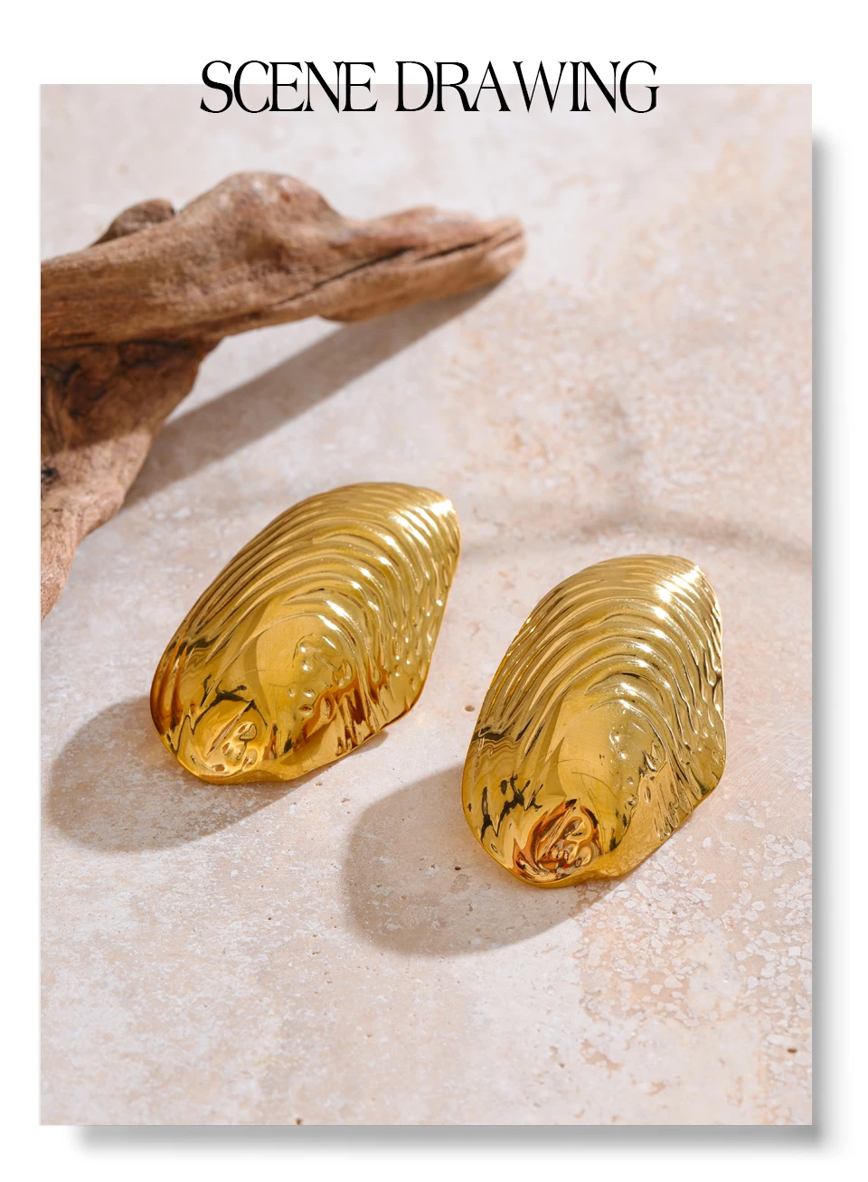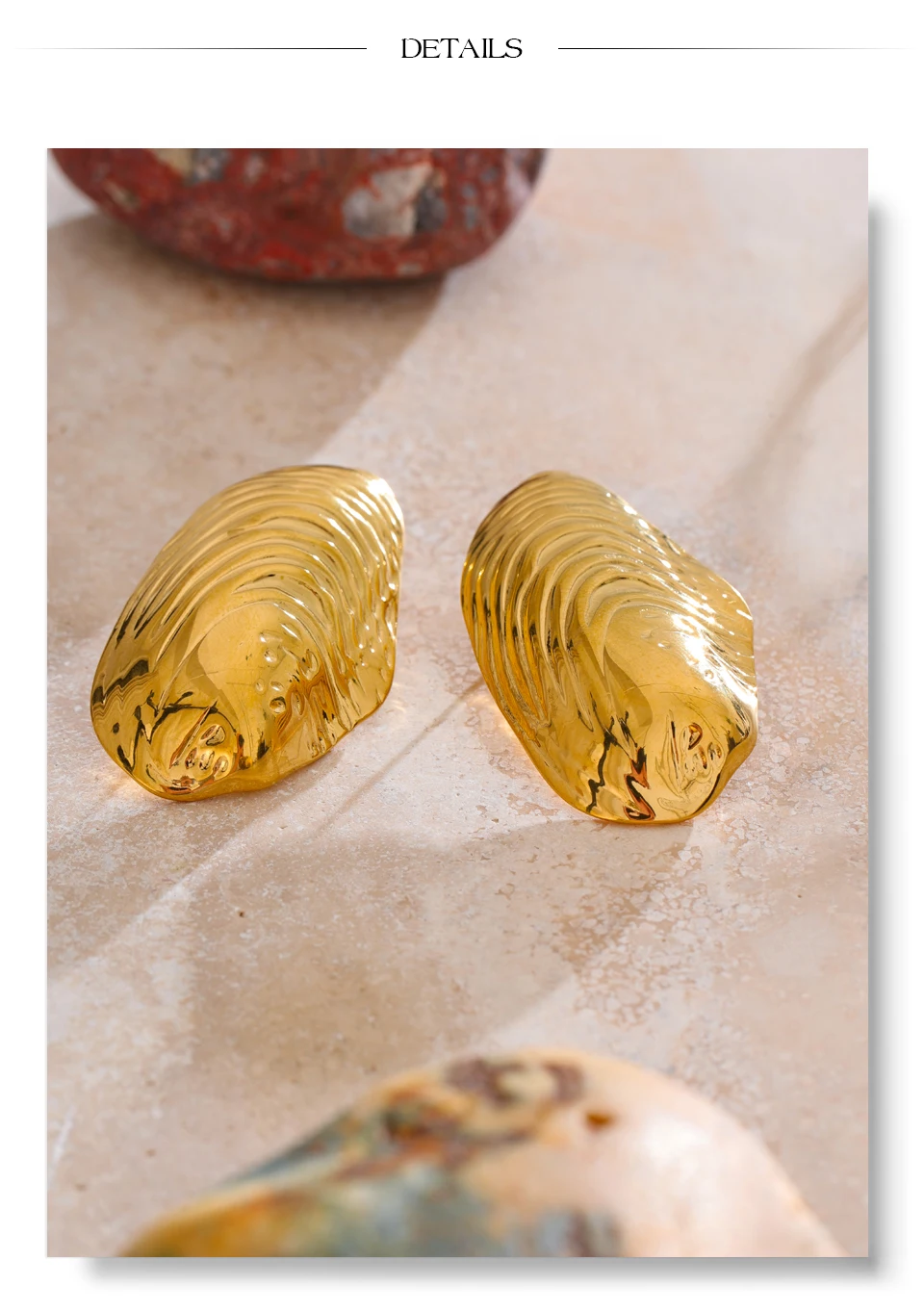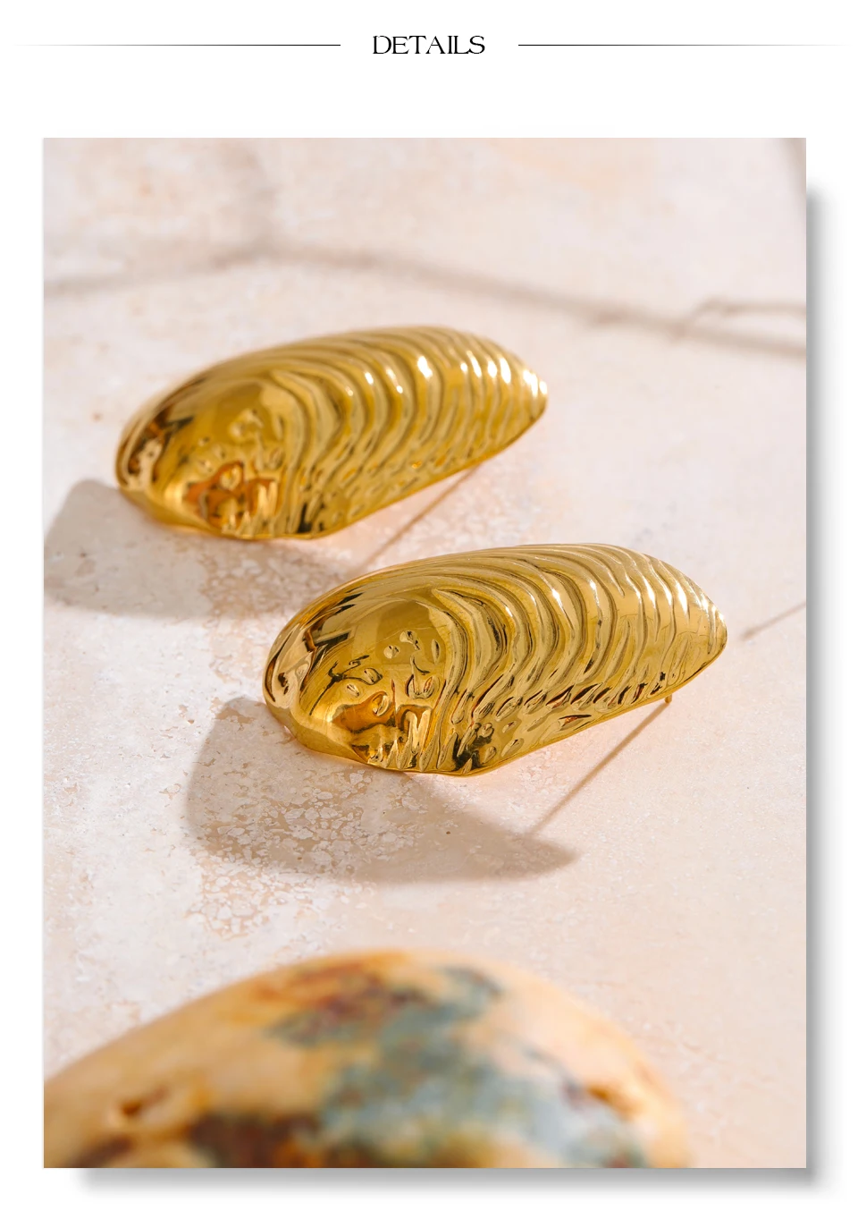 Shell-shaped earrings are crafted from PVD gold-plated stainless steel, with textured wave details.